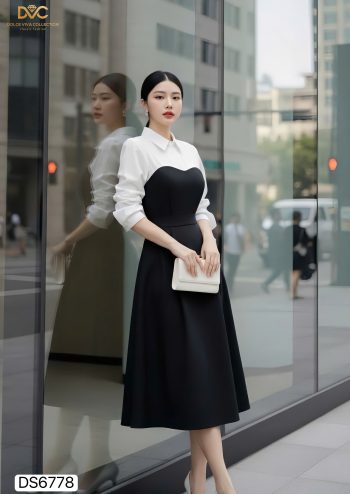 Phần thân trên với cổ áo sơ mi tạo nên vẻ ngoài cổ điển và thanh lịch, kết hợp cùng chân váy xòe nhẹ nhàng mang lại sự thoải mái mà vẫn giữ được nét duyên dáng