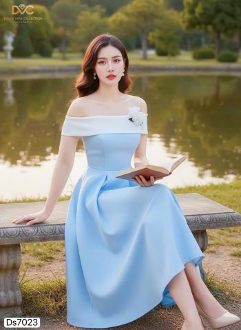𝐁𝐥𝐞𝐮 𝐂𝐞́𝐥𝐞𝐬𝐭𝐞 – Đ𝐚̂̀𝐦 𝐭𝐫𝐞̂̃ 𝐯𝐚𝐢 𝐱𝐚𝐧𝐡 𝐩𝐚𝐬𝐭𝐞𝐥 𝐬𝐚𝐧𝐠 𝐭𝐫𝐨̣𝐧𝐠Đầm DS7023 mang sắc xanh dịu nhẹ như bầu trời sớm mai, tôn lên vẻ thanh khiết và quý phái. Thiết kế trễ vai phối bản cổ trắng tinh tế, điểm nhấn hoa nổi tạo nét mềm mại và duyên dáng. Dáng xòe nhẹ giúp tôn vòng eo thon, hoàn hảo cho các buổi tiệc, dạo phố hay hẹn hò lãng mạn.